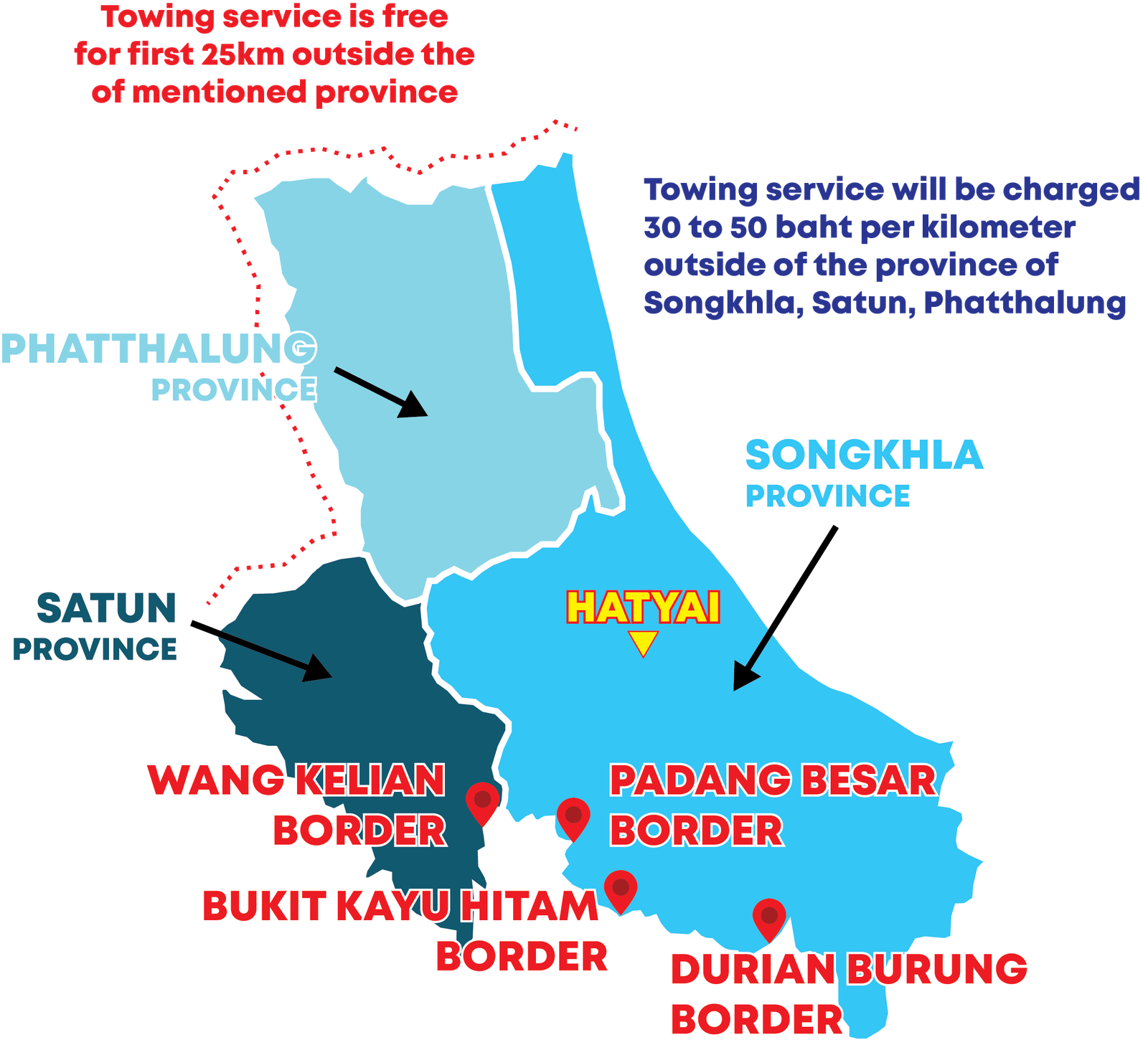 Towing service – towing your vehicle to a workshop or to the Malaysia–Thailand border when it becomes inoperable due to mechanical or electrical failure, and not caused by natural disasters.